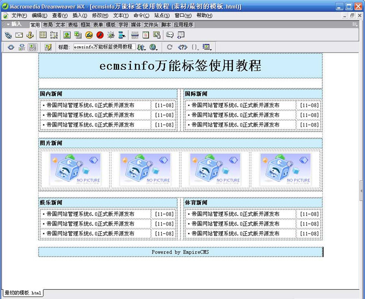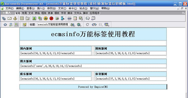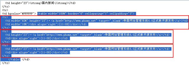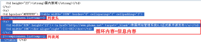 然后,在循環內容的頂部和底部,分別加上列表頭[!--empirenews.listtemp--]和列表尾[!--empirenews.listtemp--]