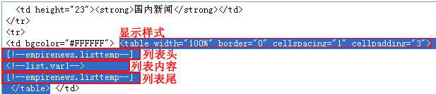 列表頭和列表尾用[!--empirenews.listtemp--]表示,是固定的,代表循環的開始和結束。