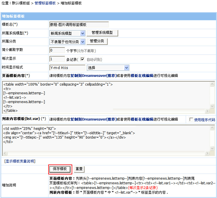 所以,萬能標簽的確定過程就是標簽模板的確定過程。 因此,要得到標簽模板ID值,就要先登陸帝國CMS后臺增加標簽模板。 |