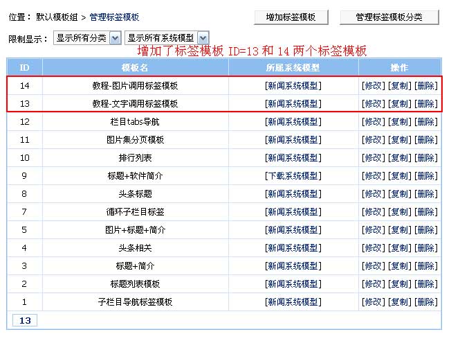 即標簽模板的ID值,是我們在帝國CMS后臺增加標簽模板后,由CMS系統自動分配的。一個標簽模板對應一個ID。