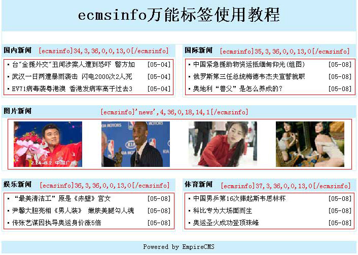 [ecmsinfo]欄目ID,顯示條數,標題截取數,是否顯示欄目名,操作類型,標簽模板ID,只顯示有標題圖片[/ecmsinfo]