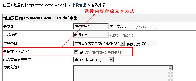 首先,你的字段名要為newstext;然后增加字段時選擇“數據存放文本文件”選項即可,如下圖: