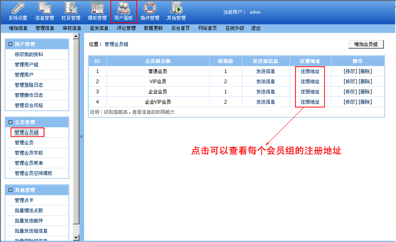 一、登陸后臺->“用戶面板”->“管理會員組”,可以查看到所有會員組的注冊地址: