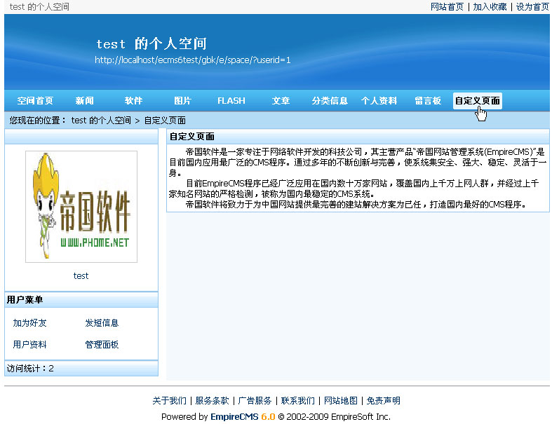 帝國CMS 6.0功能解密之會員空間自定義單頁面