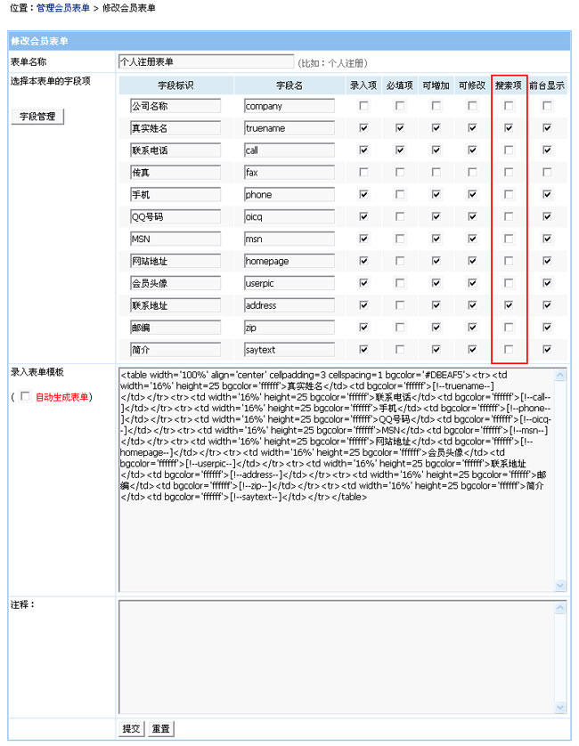 使用會員搜索自定義字段說明: 默認支持搜索username字段,其它自定義字段搜索要在會員表單中將字段選擇為“搜索項”才能使用搜索功能。