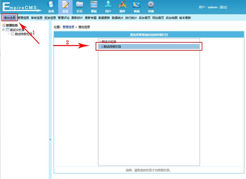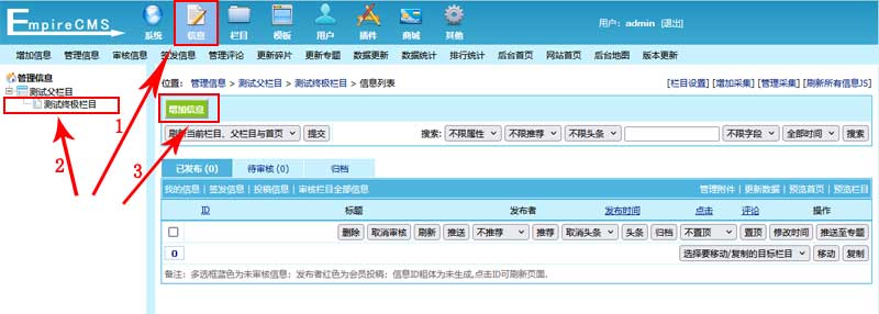 (增加信息前要先增加欄目,新手可以先看增加欄目教程)