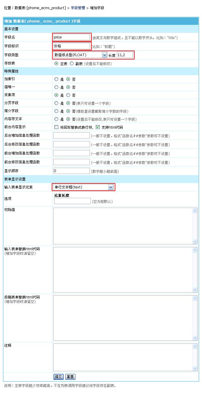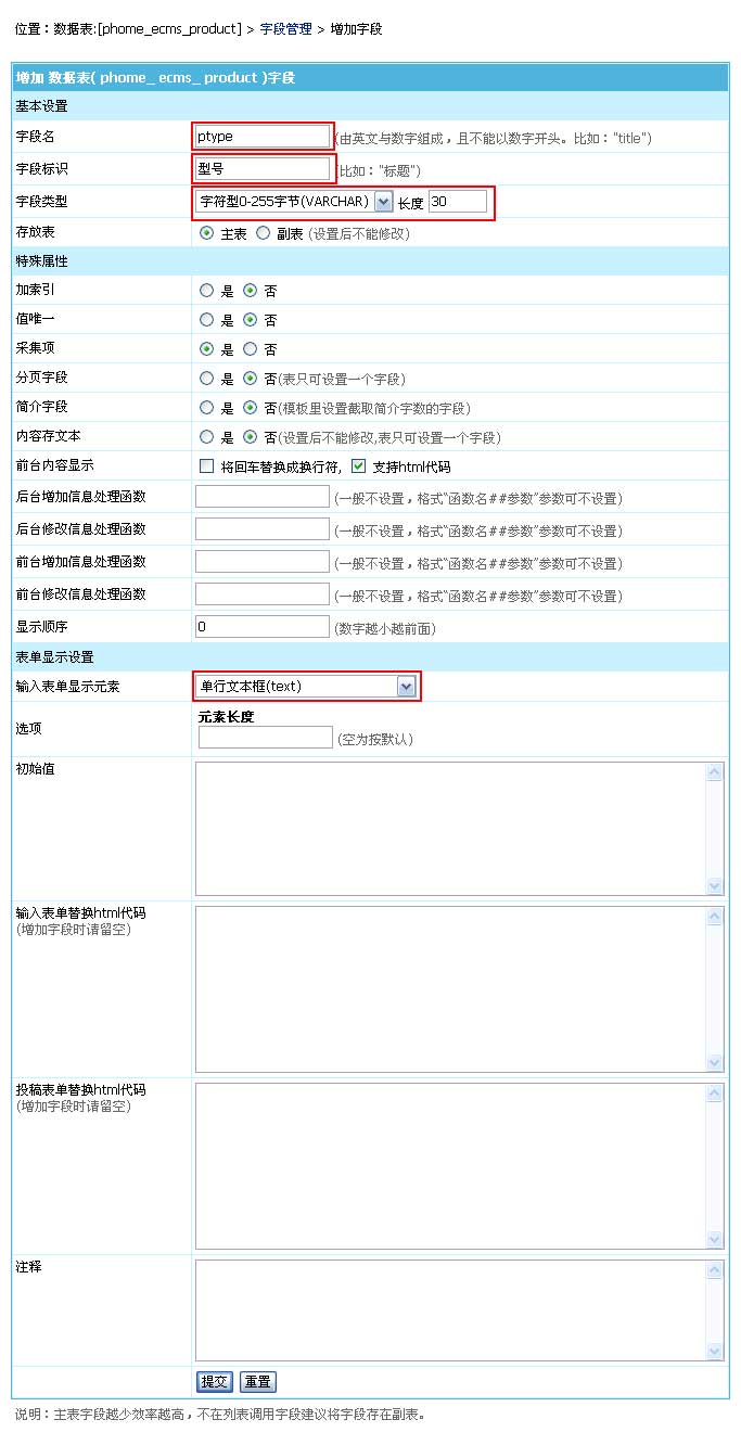 | 1、登錄后臺->“系統(tǒng)”->“數(shù)據(jù)表與系統(tǒng)模型”->“管理數(shù)據(jù)表”->點(diǎn)擊產(chǎn)品數(shù)據(jù)表的“管理字段”->“增加字段”,進(jìn)入如下界面: |