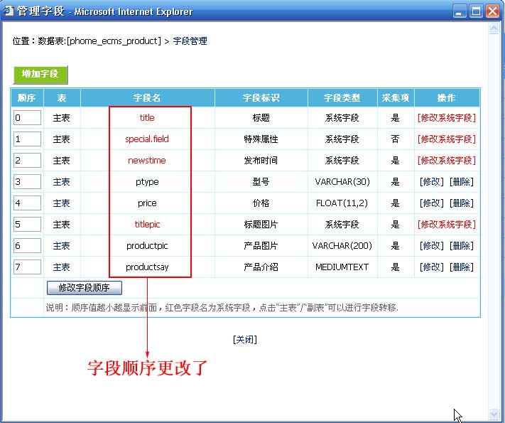 | 修改字段順序后字段列表顯示如下圖: |