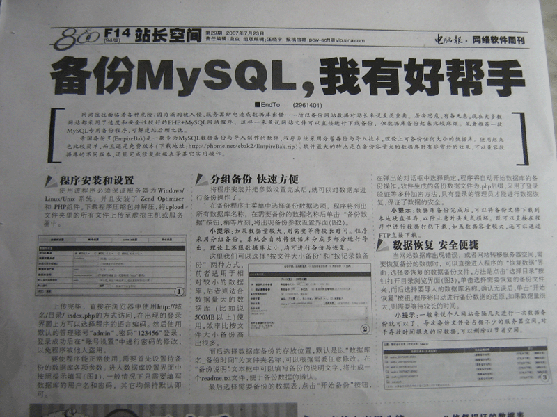 7月23日 《電腦報(bào)》第29期 F14版 以標(biāo)題為“備份Mysql,我有好幫手”對(duì)【帝國(guó)備份王】進(jìn)行了整版報(bào)道。