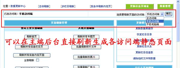 帝國CMS7.5版多訪問端升級:支持在主端后臺刷新生成各訪問端靜態頁面,多訪問端用靜態模式下使用更方便。