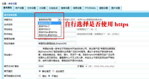 帝國CMS7.5版可自行靈活選擇是否使用HTTPS: 1、支持由系統自動識別當前服務器是否使用HTTPS。