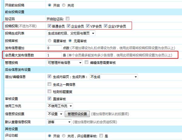 帝國CMS7.5版支持設置單個欄目里單個會員只能發布多少條信息,可依自己網站需求設置。比如:可設置該欄目下一個會員只能發布一條信息。