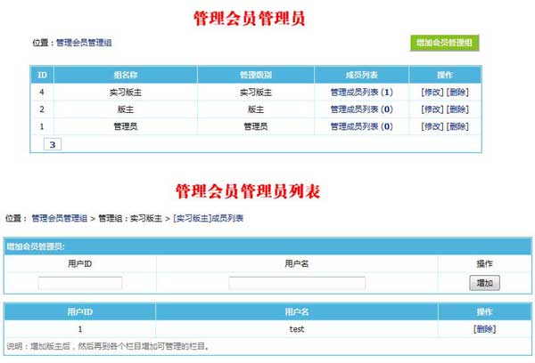 1、默認增加管理員與版主兩個管理組,也可以自行增加管理組、組名稱自定義。