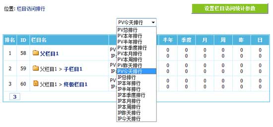 3、后臺可按統計PV或IP來顯示欄目排行,網站各欄目訪問量一目了然,可對欄目進行比較,幫助管理員決策。