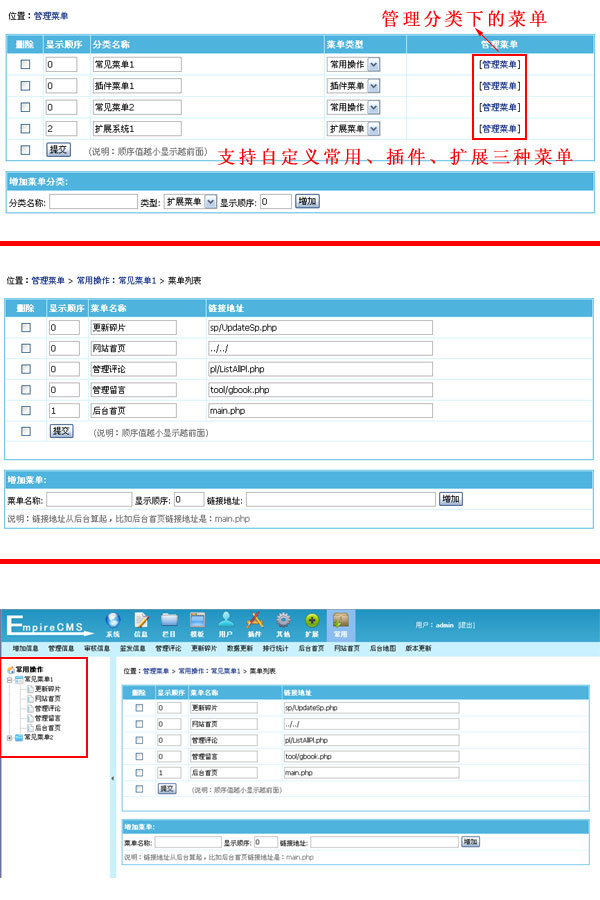 帝國CMS 6.6版新增常用操作、插件菜單及擴展菜單自定義功能,擴展系統(tǒng)更方便。