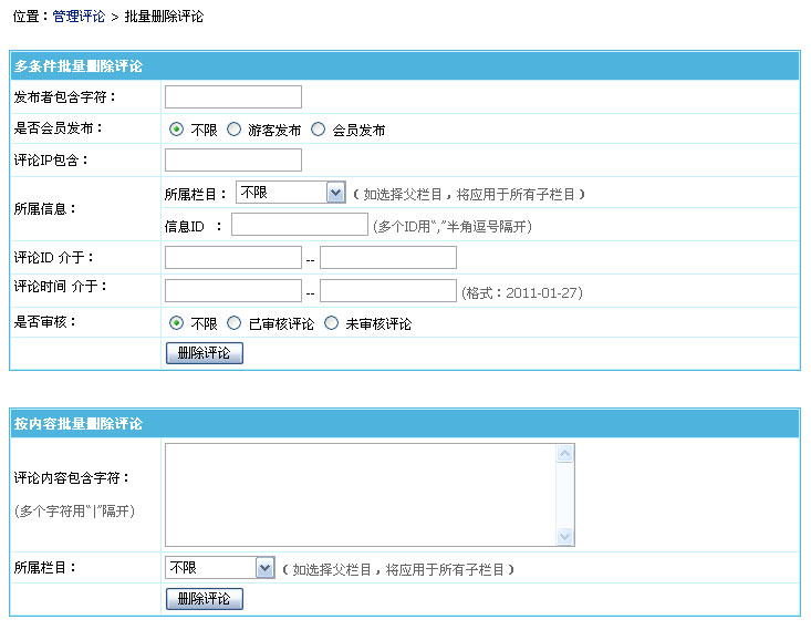 評論是網站互動比較多的功能,經常會出現一些垃圾內容,給網站管理帶來難度,所以帝國CMS 6.6版針對用戶反映開發了按多條件刪除評論功能,讓評論管理更快捷: 1、增加按多條件批量刪除評論功能 (1)、支持按用戶名、IP查詢刪除 (2)、支持評論ID范圍刪除 (3)、支持發布時間范圍刪除 (4)、支持是否只刪除審核或未審核評論 (5)、支持是否只刪除游客或會員的評論 (6)、支持按欄目和信息ID刪除評論。