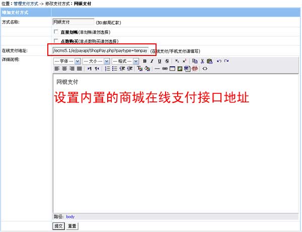 商城支付方式里可設(shè)置內(nèi)置的在線支付接口地址;設(shè)置后購(gòu)買商品后可直接在線支付