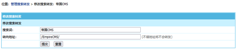 帝國(guó)CMS8.0版新增搜索轉(zhuǎn)發(fā)功能,可以指定某搜索關(guān)鍵詞轉(zhuǎn)到指定頁(yè)面:
